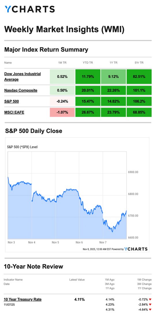 Source: YCharts.com, November 8, 2025. Weekly performance is measured from Monday, November 3, to Friday, November 7. TR = total return for the index, which includes any dividends as well as any other cash distributions during the period. Treasury note yield is expressed in basis points.
